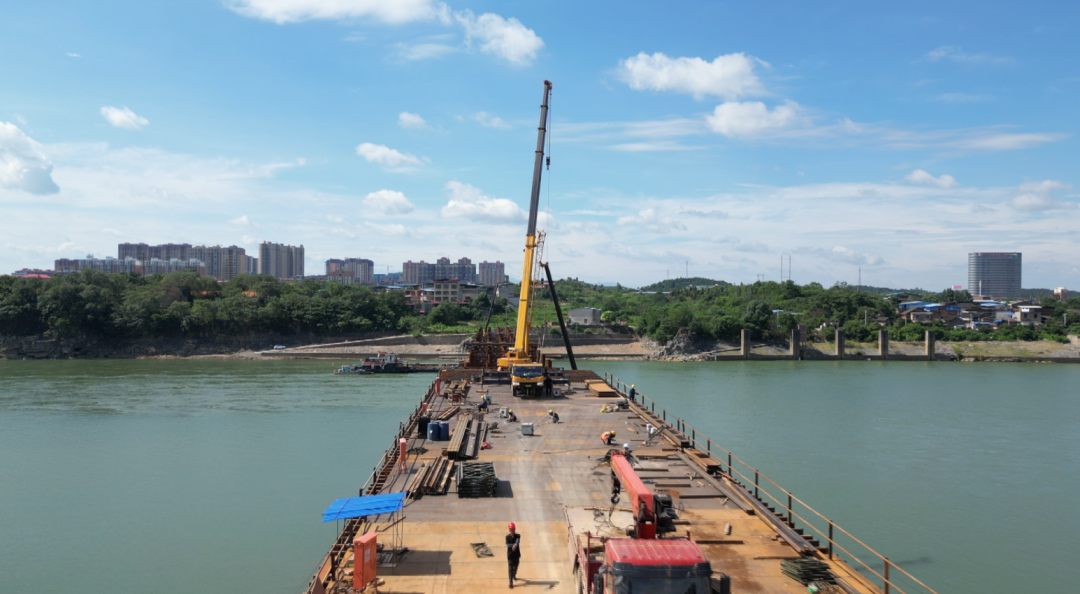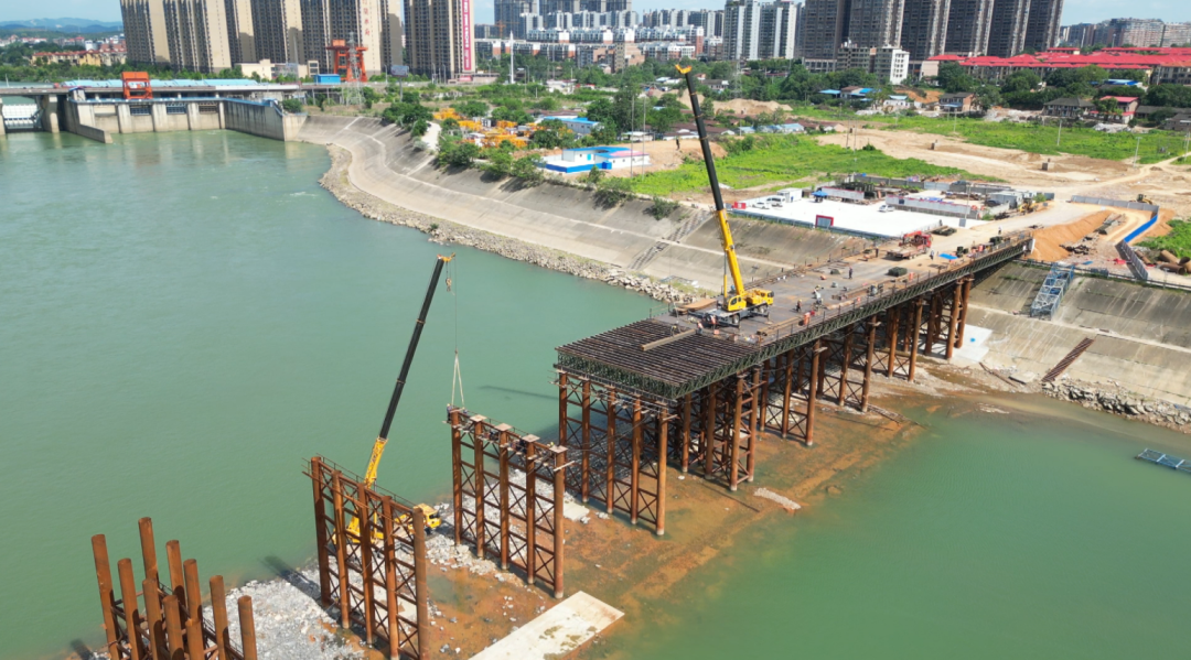 湘江永州至衡阳三级航道建设三期工程浯溪二线船闸改扩保通钢栈桥施工现场。