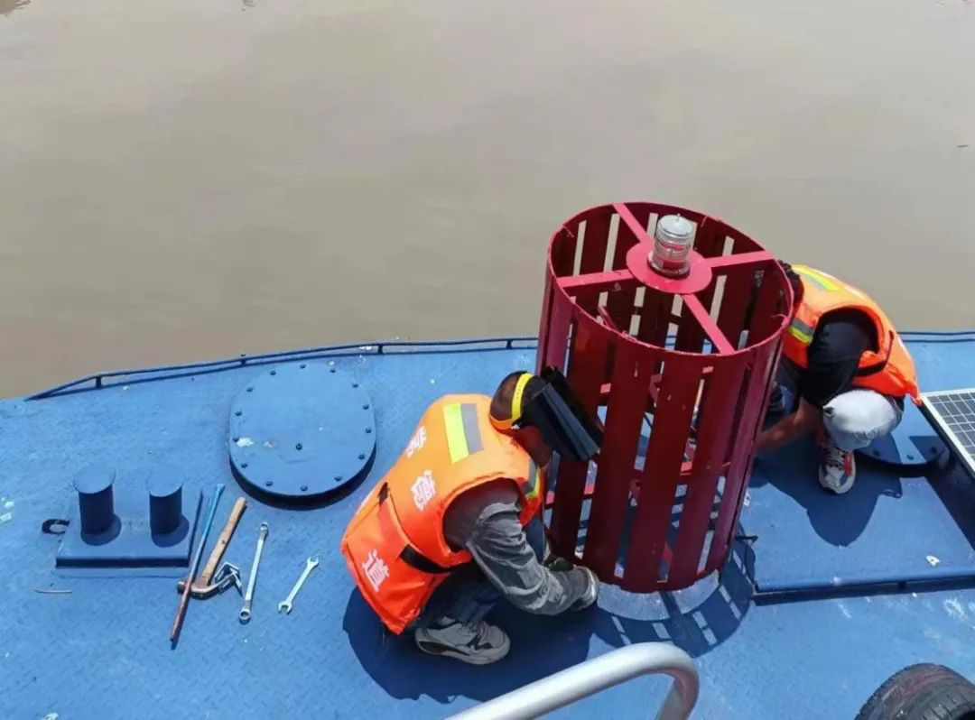 常德航道事务中心安乡航道管理处工作人员在烈日下修理航标船灯架。