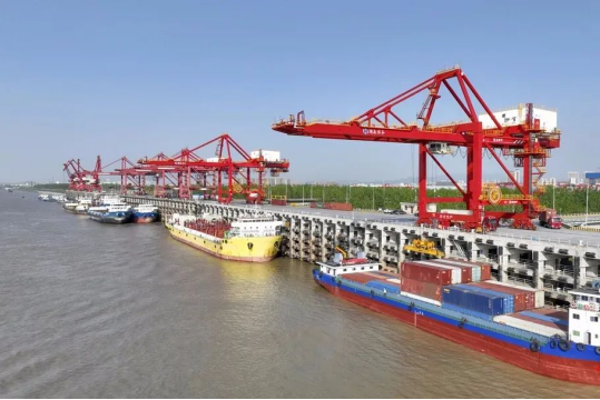 城陵矶国际集装箱码头集装箱装卸作业如火如荼。