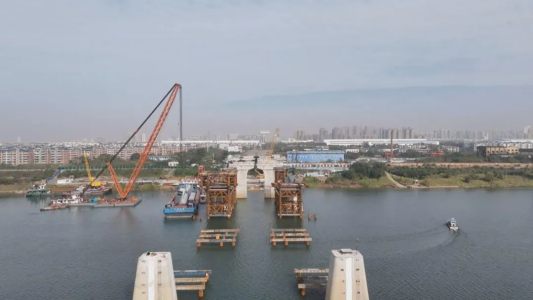 寒冷冬日下,停滞了近两年的湖南省湘潭市杨梅洲大桥建设项目上,多名建筑工人正在桥下绑扎桥梁钢筋,桥墩上的工人们正在焊接施工,现场一派火力全开、如火如荼的建设施工场景。