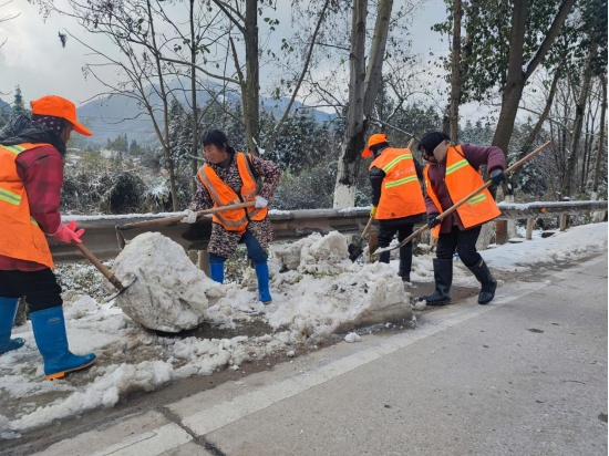 在南风坳、云冰山景区路段,中共党员、副主任李广粮组织公路养护人员沿线人工抛洒融雪剂清理路面,砍伐倒伏的树枝,引导车辆缓慢通行。
