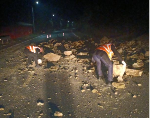 21时左右,国道G536K236+100米路段出现塌方,大量落石垮塌,堆积路面全幅中断。江南交通事务所立即组织人员赶赴现场进行清理,经过手搬手抬,一块块大石头移至靠山体的一侧,经过约两个小时的奋战,恢复了国道大半幅路面的有效通行。