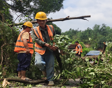 7月2日下午3时,连日暴雨过后天空开始放晴,长沙县交通运输局青山铺中队副中队长黎可和队员们却依然忙碌在S319道路修复一线。伴随着“滋滋滋……”的电锯声,横跨在马路上的大树被切割成几段,黎可和队员们将树墩套上绳索,使出全身力气一趟又一趟把粗大笨重的树墩运转到车上,不一会,黎可就满头大汗,湿透了全身。奋战一个多小时后,处于半通行状态的S319露出“清爽面貌”,宽敞的双向车道恢复往日畅行。