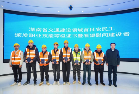 近日,湖南省交通建设领域首批农民工职业技能等级证书颁发活动在茶江高速农民工素质和技能提升中心站举行,23名来自省内高速公路、重点水运建设项目一线的钢筋工、电焊工获得由国家人社部门认可的五级职业技能等级证书。
