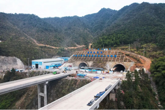 该隧道是零道高速全线关键控制性工程。施工采用双向开挖方式,前期面临严峻的进洞难题,进口端地处“山、谷、河”交织的复杂地形,进洞场地布置极为复杂;出口端下临河道及207国道,需在30米高悬崖上搭建施工平台,施工空间受到极大限制。为此,项目团队协同各参建单位及行内专家多次现场踏勘、反复论证方案,最终制定了两大优化方案,即进口端采用“桥梁缩跨+洞门外移”,出口端采取“洞门后移18米+暗洞改路基”。此举,不仅实现了双向提前进洞,进口端也避免了仰坡大面积刷坡,保护了生态红线,出口端成功规避了临悬崖施工安全风险,也降低了对207国道通行的影响。