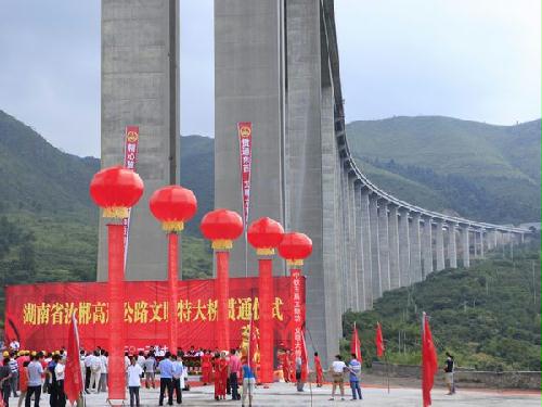 汝郴高速公路是国家重点规划建设的西部大开发八条公路通道之一厦(厦门)蓉(成都)高速公路的重要组成部分,文明特大桥是其关键控制性工程之一。该桥左幅桥长l775.38m,右幅桥长1795.88m,总投资3.4亿元,合同工期42个月,是省内跨度最多、结构最复杂的连续刚构桥,也是目前国内罕见、湖南规模最大的百米高墩群桥。其平均桥墩高84米,其中百米以上高墩达12个,最高桥墩高达110.4米;其主桥结构为66米+6X120米+66米变高度变截面箱梁预应力混凝土连续刚构,为国内首次将无横支撑柔性哑铃型双肢薄壁空心墩运用于连续刚构主墩,同时,将多跨分段合拢工序应用于多跨梁桥施工也开了全国大型桥梁建设之先河。