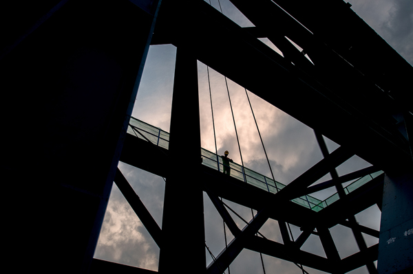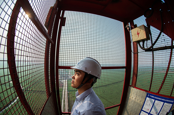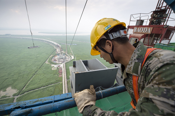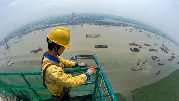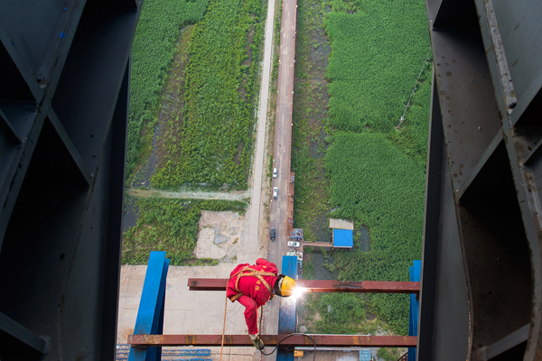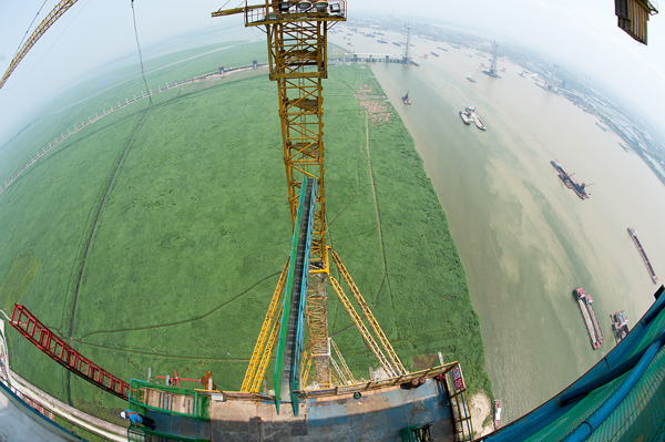 大岳高速洞庭湖大桥位于岳阳市七里山,全长2390米,东起岳阳,西接君山,跨越湘江河道,是一座主跨1480米两跨不对称钢桁梁悬索桥。大桥关键受力结构为主缆体系,单根主缆长2600米,重达10624吨,由175根索股组成,每根索股由127根直径5.35mm的高强镀锌钢丝组成。大桥建设于浩淼的洞庭湖上,施工条件复杂,建设规模宏大。(毛尚文摄影报道)