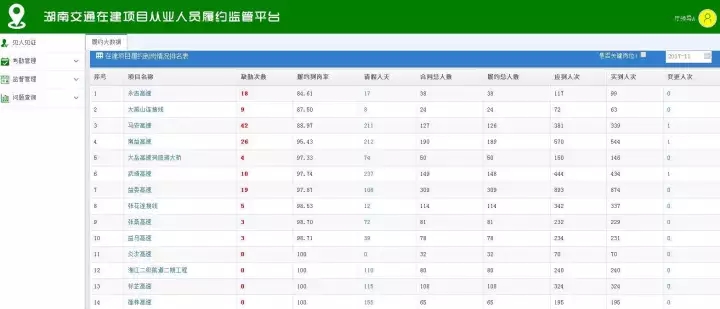 截至目前,湖南交通在建项目人员履约监管平台大数据如下: