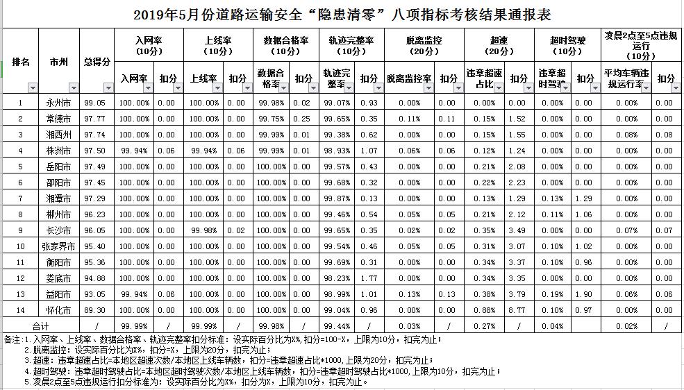 5月总体考核得分结果排名前三位的市州为永州(99.05)、常德(97. 77)、湘西(97. 74);排名后三位的市州为怀化(89. 30)、益阳(93. 05)、娄底(94. 88)。入网率除益阳(99. 94%)、株洲(99. 94%)以外,其余市州均达到100%。上线率除株洲(99. 94%)、 长沙(99. 98%) 以外,其余市州均达到100%。数据合格率除常德(99.75%)、永州(99.98%)、株洲(99. 99%)、湘西(99. 99%)以外,其余市州均达到100%。轨迹完整率排名前三位的市州为湘潭(99. 87%)、衡阳(99. 69%)、邵阳(99. 68%);排名后三位的市州为娄底(98.23%)、 株洲(98.93%)、 益阳(98. 99%)。脱离监控率,娄底、怀化、永州、湘西、岳阳、邵阳、衡阳、湘潭等8个市州无重点营运车辆脱离监控记录;排名后三位的市州为益阳(0.13%)、常德(0. 11%)、株洲(0. 06%)。超速得分排名前三位的市州为永州(20. 00)、株洲(18.76)、湘潭(18.71);排名后三位的市州为怀化(11.23)、益阳(16.21)、长沙(16. 51)。超时驾驶除益阳(8.10)、 湘潭(8. 71)、郴州(8.94)、张家界(8.98)、怀化(9. 03)、衡阳(9. 04)以外,其余市州均为满分10分。凌晨2点至5点违规运行率除湘西(0. 08%)、长沙(0.07%)、 益阳(0. 06%)以外,其余市州均无重点营运车辆违规运行记录。