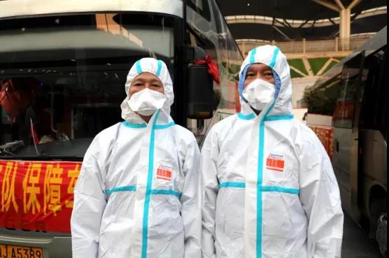 (当天18时,35名湘雅常德医院队员走出长沙高铁站。两位身着防护服的司机已站在两台“抗疫医疗队保障车”大巴前等候“白衣战士”的归来。)