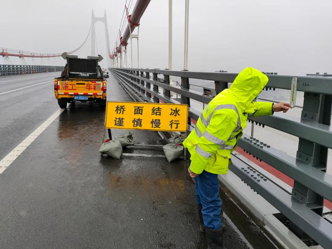 ▲新一轮寒潮来袭,湖南高速集团岳阳分公司洞庭湖大桥养护所时刻关注桥面温度,提前摆放好安全警示牌,确保G56杭瑞高速岳阳段洞庭湖大桥行车安全。
