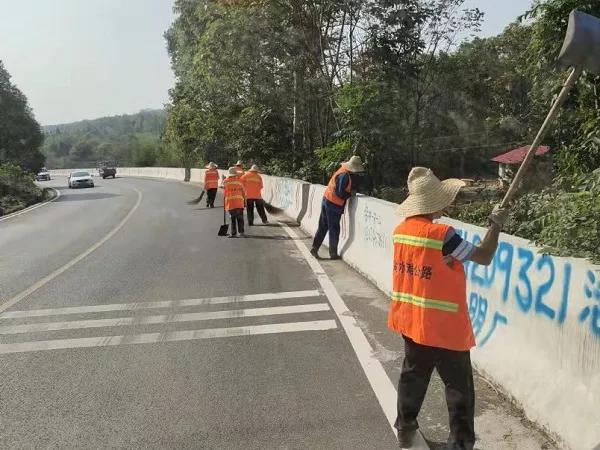 冷水江市公路建设养护中心:冷水江市公路建设养护中心所管养的公路上一片忙碌,完成了路边的杂草进行清理、更换修补破损的水泥路板、水沟修建等工作。