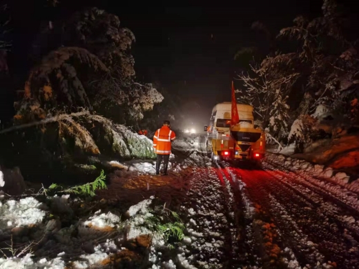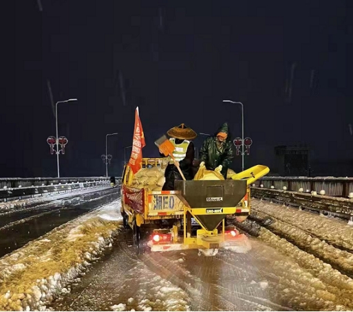 夜已深,战正浓。重点桥梁、山区路段是否已经结冰?管养公路路面有无障碍物?融雪除冰物资是否储备完善?公路部门兵分多路,以桥面路段、背阴、长下坡、急弯等易积雪易冻路段为重点,通过人工结合机械抛撒融雪剂、设置警示标牌等方式,及时消除积雪、结冰等安全隐患。