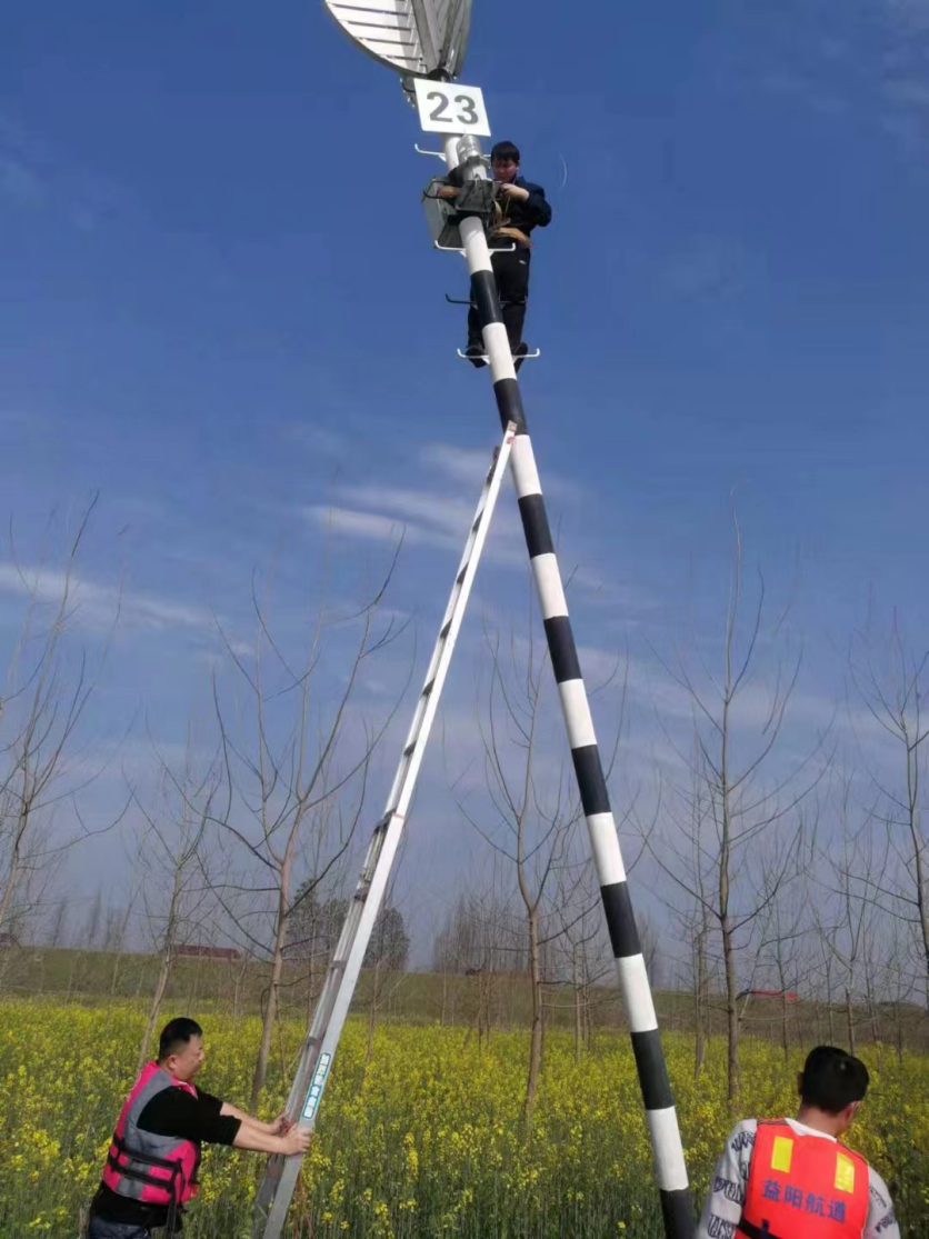 黄茅洲航道处职工顶着烈日修护航标灯。