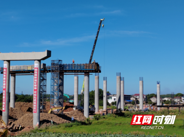 湘江岸边,一些施工人员顶着烈日在已初具雏形的引桥桥墩顶上施工。“目前,11号墩、14号墩已经完成浇筑,12号墩与13墩已经完成20根桩基施工。桩基完成了139根,完成设计量的62%。引桥完成了立柱18根、系梁9道、盖梁3道。”醴娄高速第四合同段项目副经理谢烨介绍。