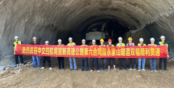近日,官新高速项目永家山隧道左洞顺利贯通,标志着官新高速第六合同段隧道全部贯通。