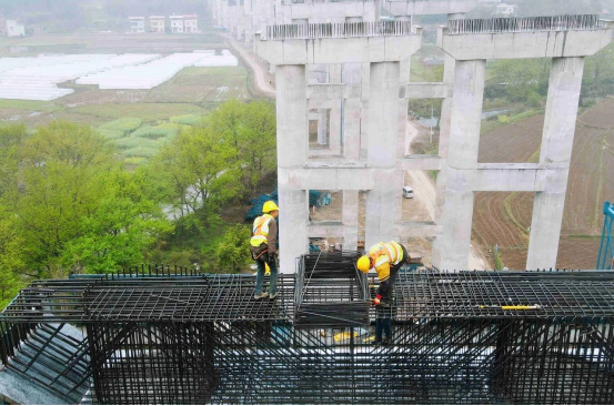 在宥江特大桥施工现场,作业人员正在进行盖梁钢筋绑扎作业。宥江特大桥于2022年3月16日开始施工,目前,大桥桩基、承台、地系梁、肋板已全部完成,墩柱完成95%,盖梁完成70%,剩余桥梁下部结构施工及T梁预制正在加快推进。