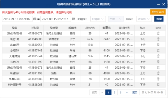 运砂船智能检测预警功能模块——湘江入长江口检测线船舶流量统计。
