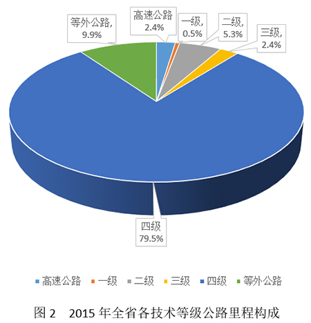 全省各技术等级公路里程分别为:高速公路5653公里、一级公路1292公里、二级公路12606公里、三级公路5618公里、四级公路188343公里、等外公路23374公里。等级公路里程213512公里,比上年末增加2233公里,等级公路占公路总里程90.1%,提高0.7个百分点。其中,二级及以上公路里程19550公里,增加1322公里,占公路总里程8.3%,提高0.5个百分点。