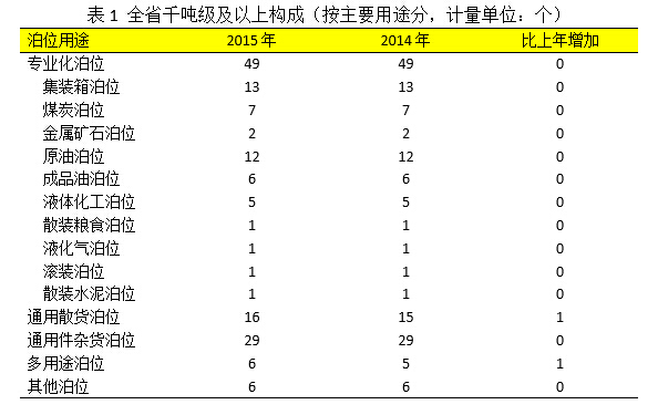 全省港口拥有千吨级及以上泊位106个,比上年末增加2个。其中,专业化泊位49个,通用散货泊位16个,通用件杂货泊位29个,多用途泊位6个,其他泊位6个,与上年末比分别为持平、增加1个、持平、增加1个和持平。
