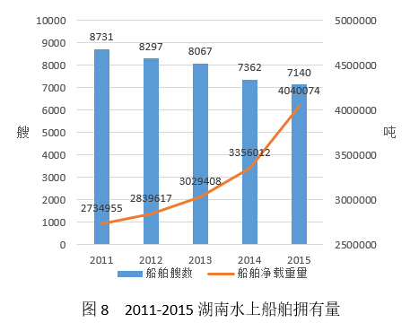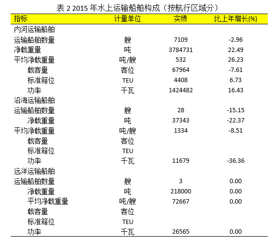 年末拥有轮驳船7140艘,比上年末减少3.0%;净载重量4040074吨,增长20.4%;载客量67964客位,减少7.6%;集装箱箱位4408TEU,增长6.7%;船舶功率1462726千瓦,增长15.3%。