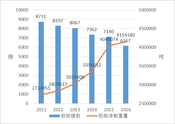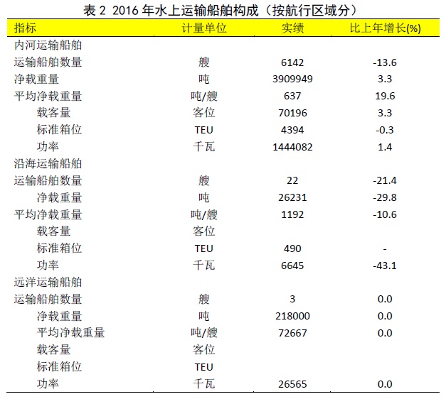 年末拥有轮驳船6167艘,比上年减少13.6%;净载重量4154180吨,增长2.8%;载客量70196客位,增长3.3%;集装箱箱位4884TEU,增长10.8%。