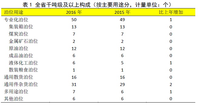 全省港口拥有千吨级及以上泊位110个,比上年末增加4个。其中,专业化泊位50个,增加1个,通用散货泊位16个,与上年持平,通用件杂货泊位31个,增加2个,多用途泊位7个,增加1个,其他泊位6个,与上年持平。