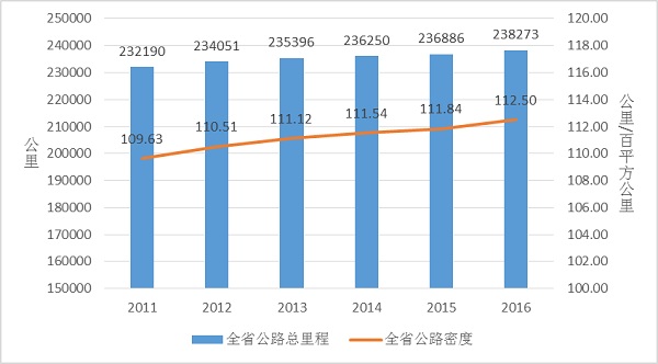 年末全省公路总里程238273公里,比上年末增加1387公里。公路密度112.50公里/百平方公里,增加0.66公里/百平方公里。公路养护里程238273公里,占公路总里程100%。