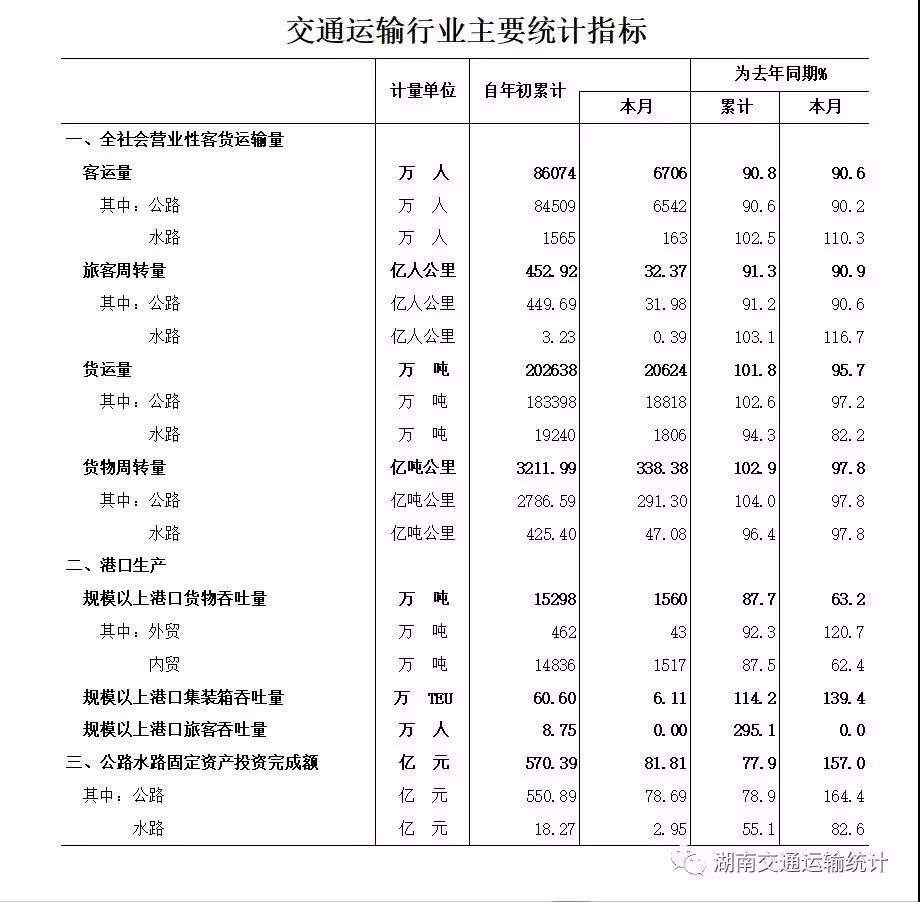 主要指标:湖南省2018年11月交通运输行业统计月报