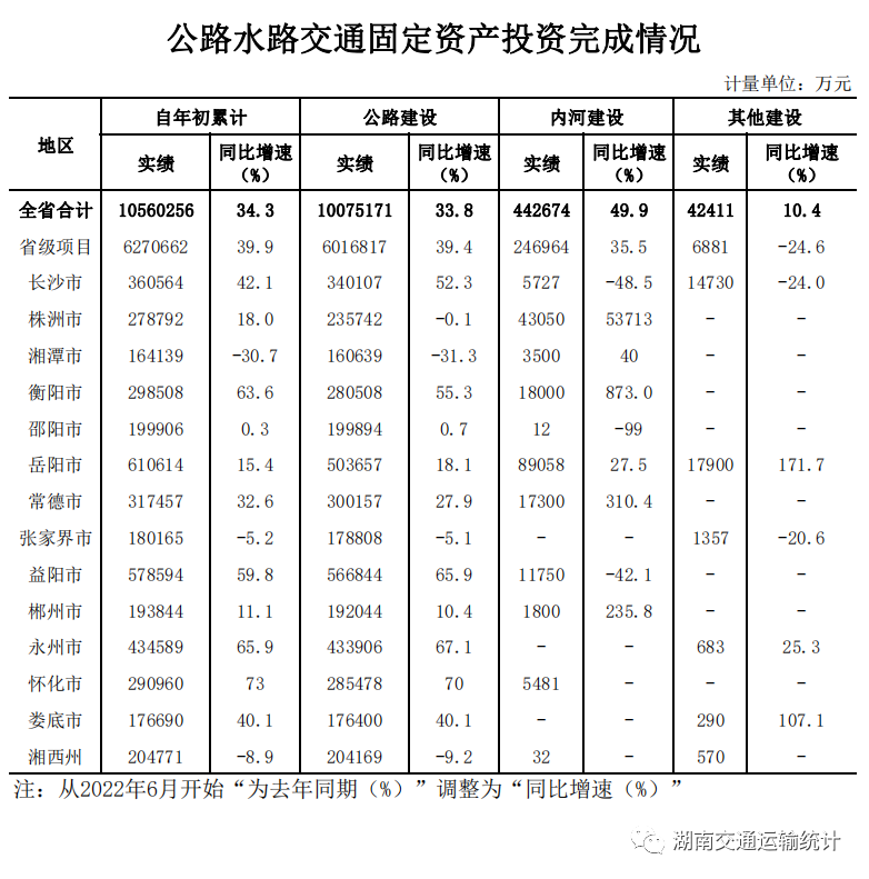 湖南省2022年10月公路水路交通固定资产投资完成情况