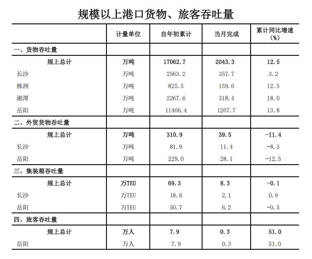湖南省2025年9月规模以上港口货物、旅客吞吐量
