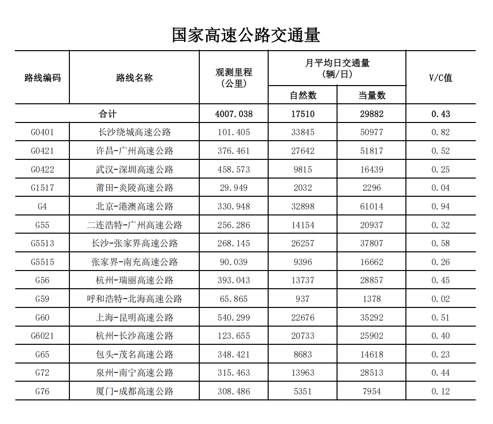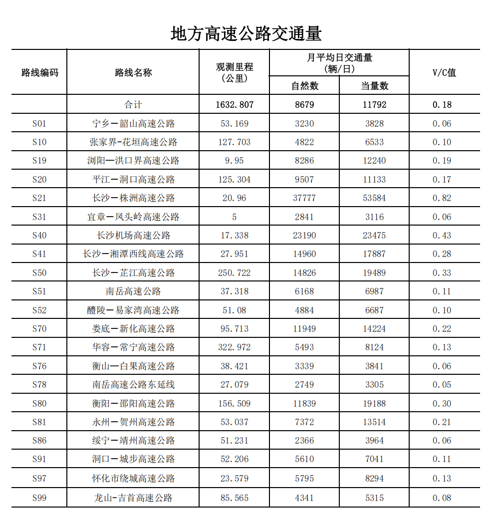 湖南省2026年1月高速公路交通量