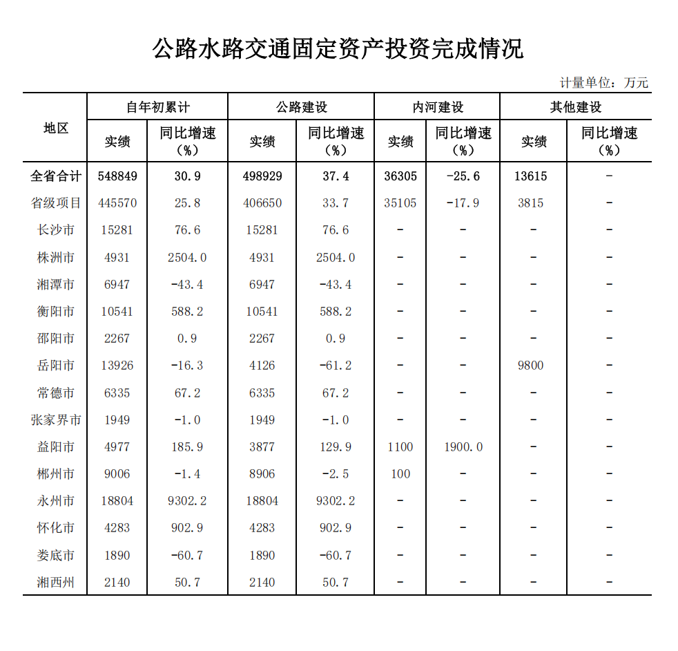 湖南省2026年1月公路水路交通固定资产投资完成情况