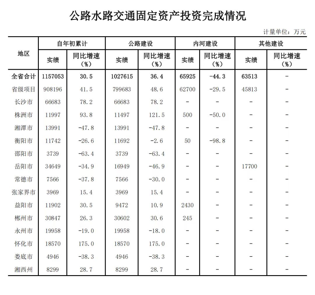 湖南省2026年2月公路水路交通固定资产投资完成情况