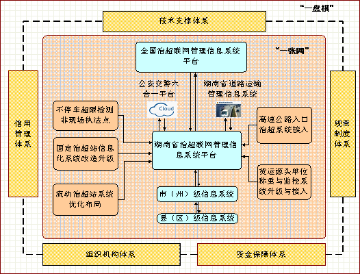 统一规划构建基于“1+1”的湖南省信息化治超体系,即:“一张网”,推进路面不停车超限检测系统、“预检+精检”系统和流动治超站系统、货运源头单位称重与监控系统、高速公路入口称重系统等站点建设,并建成全省治超联网管理信息系统(含部、省、市、县四级),实现信息化治超“一张网”;“一盘棋”,通盘考虑,基于信息化,以技术支撑、规章制度、信用管理、组织机构、资金保障五大体系为保障,形成全省治超工作“一盘棋”。