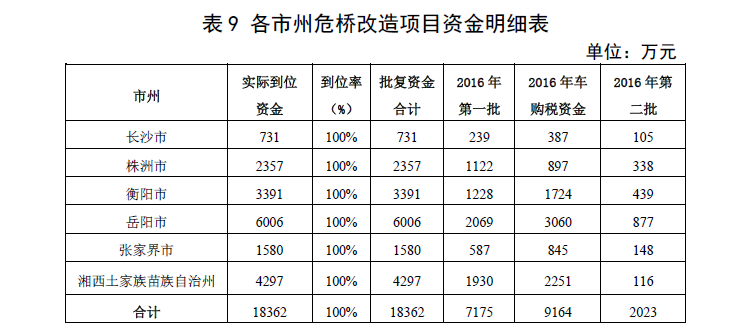2016年省交通运输厅纳入现场评价危桥改造专项资金18362万元,分别为:2016年第一批危桥改造资金7175万元,2016年车购税资金9164万元,2016年第二批资金2023万元。资金到位18362万元,到位率100%。具体情况如下(表9):