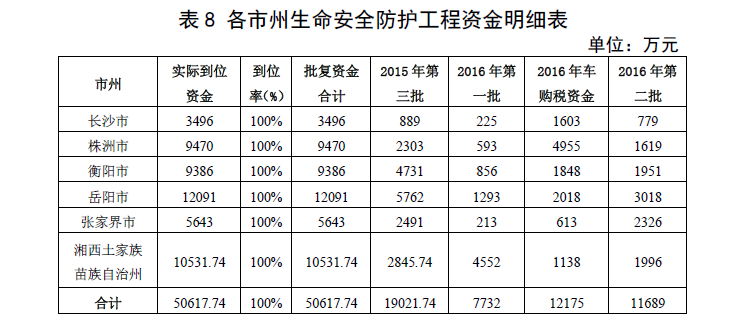 2016年省交通运输厅纳入现场评价生命安全防护工程专项资金50617.74万元,分别为:2015年第三批安保19021.74万元,2016年第一批安保7732万元,2016年车购税资金12175万元,2016年第二批安保11689万元。资金到位50617.74万元,到位率100%。具体情况如下(表8):