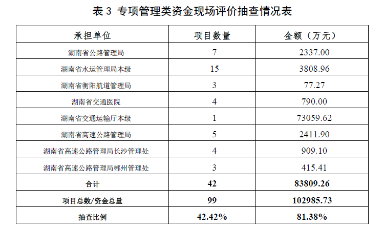 2016年省交通运输厅纳入现场评价省直单位管理类资金83809.26万元,资金抽查比例达81.38%;抽查项目个数为42个,具体情况如下(表3):