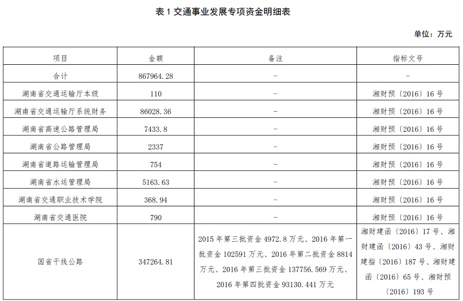 2016年交通事业发展专项资金的管理使用涉及我厅本级、厅系统财务、省高速公路管理局、省公路局等8个预算单位以及各市州县财政局、交通运输局、公路管理局等有关单位,涉及专项资金总量为867964.28万元,包括:建设类资金654578.55万元、养护类资金110400万元、管理类资金102985.73万元。具体情况如下(表1):