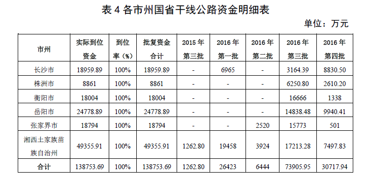 2016年,我厅纳入现场评价的国省干线公路建设资金为138753.69万元,分别为:2015年第三批资金1262.8万元,2016年第一批资金26423万元,2016年第二批资金6444万元,2016年第三批资金73905.95万元,2016年第四批资金30717.94万元。资金到位138753.69万元,到位率100%。具体情况如下(表4):