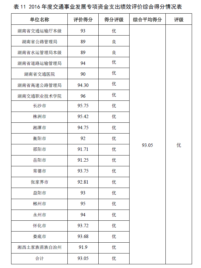 在评价单位全面自评的基础上,我厅对纳入本次评价范围的评价单位中抽取长沙市、株洲市、衡阳市、张家界市、湘西土家族苗族自治州和部分二级单位按绩效评价参考指标规定的条件和分值逐一进行现场评分,剩余八个市州的评分根据自评材料认定。我厅采用简单数学平均法计算2016年度交通事业发展专项资金支出绩效评分。经计算,我厅绩效评价综合得分为93.05分,总体评价结果等次为:优。综合得分情况见下表(表 11):