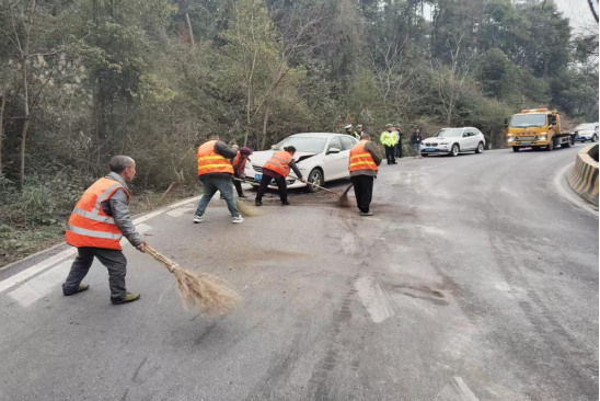严明工作纪律,强化值班值守。夯实春运值班值守责任,严格领导带班制度,人员“在岗、在职、在位”,通讯保持24小畅通,确保信息及时报送和共享。遇紧急突发状况,守好一个原则“以畅为令,先主后次,先赴后续,人到路通”。节假日期间共接到2次群众致电发生险情:G209线下寨河路段油污路面受到影响,极易引发二次交通事故;G209线下寨河梨子园路段枯树倾倒交通受阻。中心迅速组织应急抢险人员携带物资装备,用时均20多分钟赶到事发地点进行果断处治,道路很快恢复安全畅通。