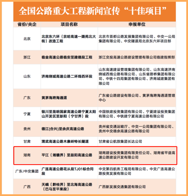 日前,由中国交通报社与中国交通报刊协会联合组织的全国公路重大工程新闻宣传“十佳项目”推选展示活动完成终评,湖南平益高速获评全国公路重大工程新闻宣传“十佳项目”,这也是今年湖南省唯一获评宣传“十佳项目”的单位。