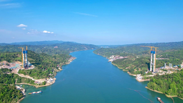张官高速公路项目控制性工程——洞庭溪沅水特大桥是湖南省内在建单孔跨径最大悬索桥。