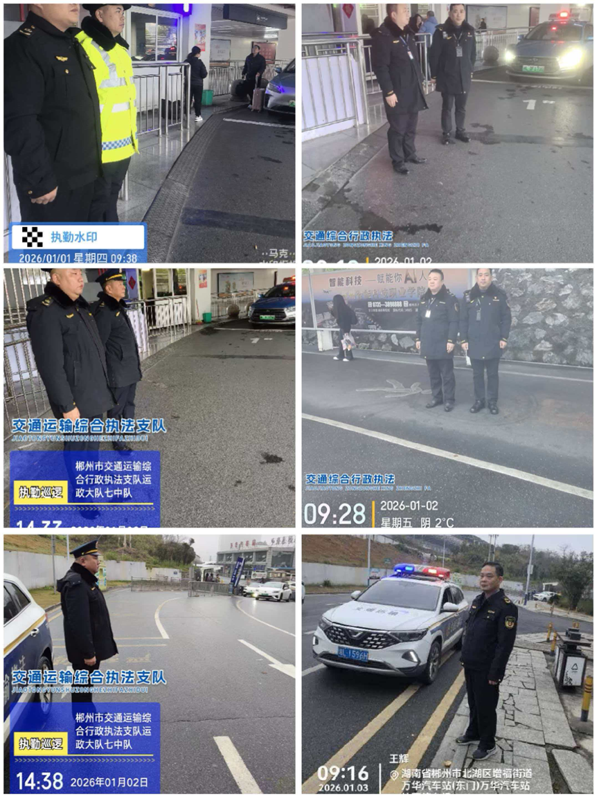 元旦假期期间,郴州市交通运输综合行政执法支队加强对郴州高铁西站的值班值守。执法人员针对出租车拒载、议价和强行拼客等违规行为进行重点监管,有效维护郴州高铁西站周边良好客运市场秩序,保障假期人民群众安全有序出行。