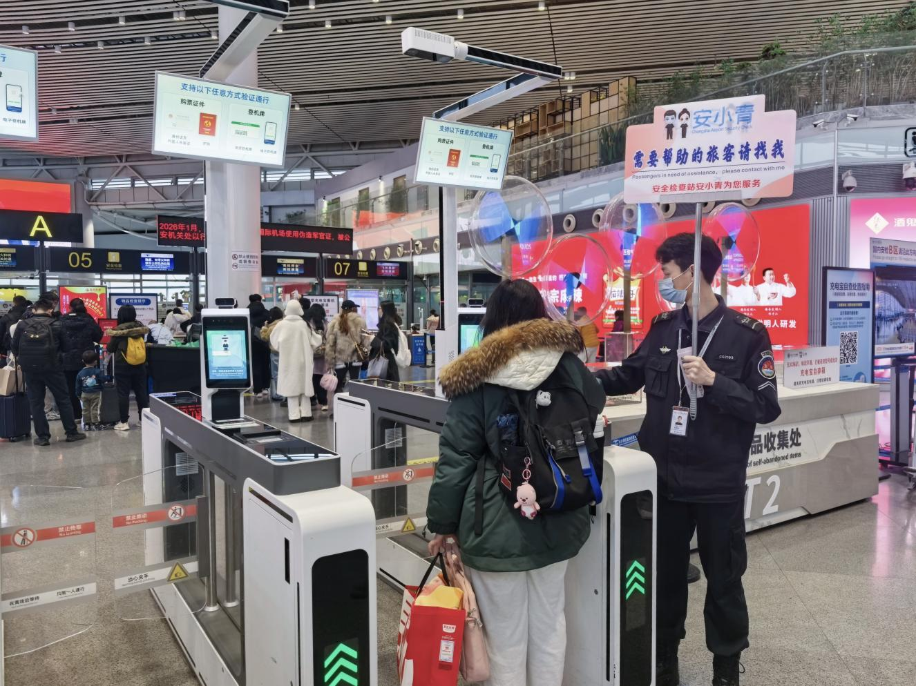 “需要帮助的旅客请找我!”安检员举着牌子,在人群中识别那些神情慌张、步伐焦急的旅客。这面小小的牌子象征着安检服务从“等着问”到“主动寻”的转变,背后是安检站一系列为提升服务品质所做的努力。党员主动录制安检温馨提示短视频,普及快速过检知识;在待检区增设违法处罚规定警示标牌、禁限带物品实物展示,以图文形式前置宣传安全规定;优化“精准分流+快速通道+高峰双开通道”机制,有效缓解旅客排队压力;持续深化“晚到旅客优先分流”“免费分装瓶申领”“春运遗忘物品加急送还”等爱心服务,将每一项措施都落在旅客最需要的地方。