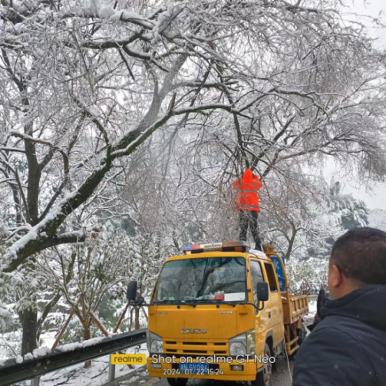 公路养护职工清理积雪积压的树枝等安全隐患