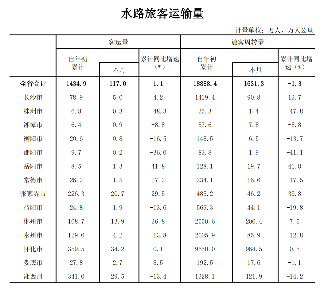湖南省2025年11月水路旅客运输量