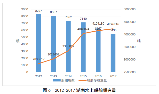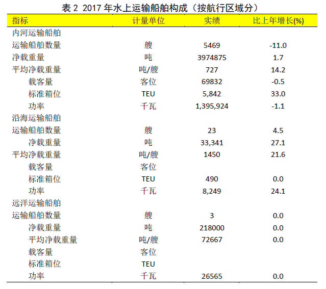 年末拥有轮驳船5495艘,比上年减少10.9%;净载重量4226216吨,增长1.7%;载客量69832客位,减少0.5%;集装箱箱位6332TEU,增长29.6%。