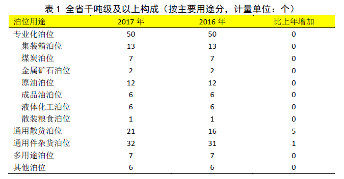 全省港口拥有千吨级及以上泊位116个,比上年末增加6个。其中,专业化泊位50个,与上年持平,通用散货泊位21个,增加5个,通用件杂货泊位32个,增加1个,多用途泊位7个,与上年持平,其他泊位6个,与上年持平。